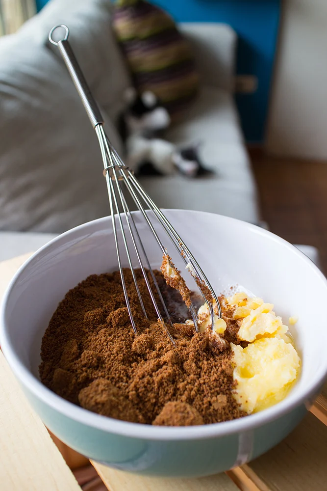 En un bol revuelve tus ingredientes secos. Aparte mezcla perfectamente el ghee con el azúcar de coco hasta que sea una pasta cremosa, ve agregando los huevos y la lechita, integra muy bien. Añade tus líquidos a los secos y mezcla perfectamente, agrega tus plátanos previamente machacados con un tenedor y combina.