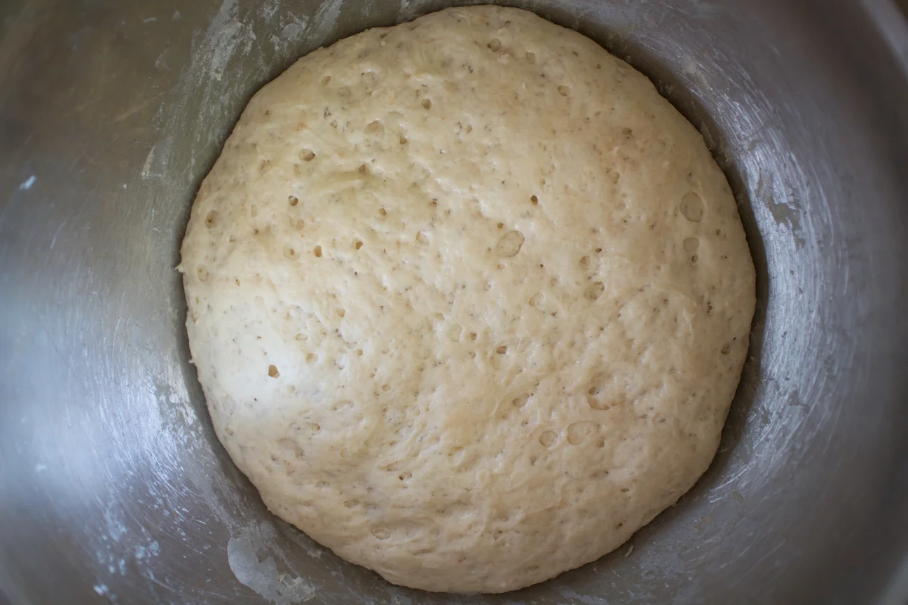 En la noche mezcla la harina con la sal en un bol, aparte disuelve bien la levadura en la leche tibia, integra todo por un par de minutos, forma una bola, no tiene que ser perfecta ya que la masa será pegajosa, tapa el bol y déjalo reposar toda la noche, este mejunje es tu poolish o prefermento, debe reposar de 8 a 12 horas.