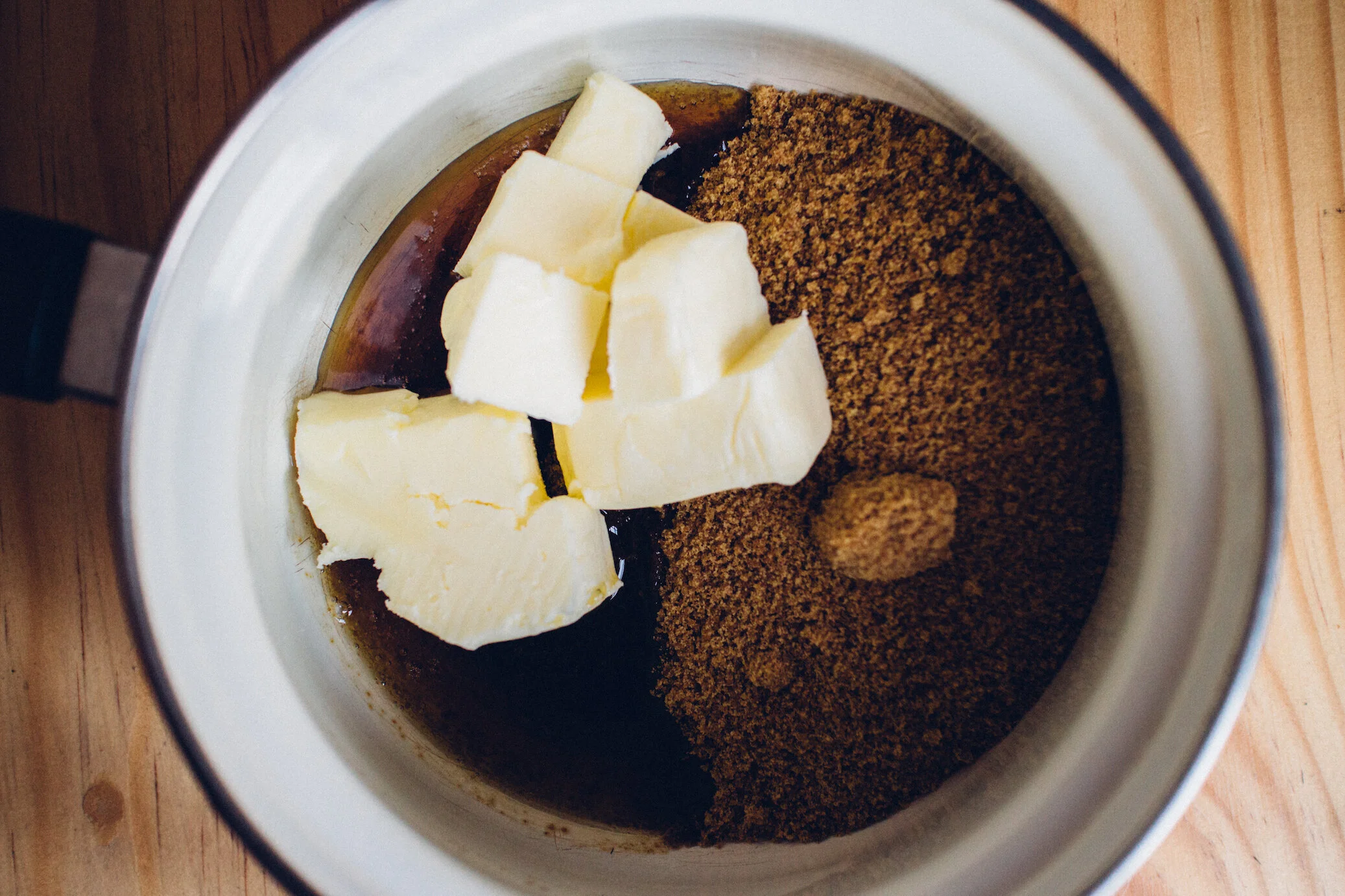En una olla pon a fuego bajo la mantequilla, maple y piloncillo, mueve constantemente hasta que todo se integre y la mantequilla se disuelva.